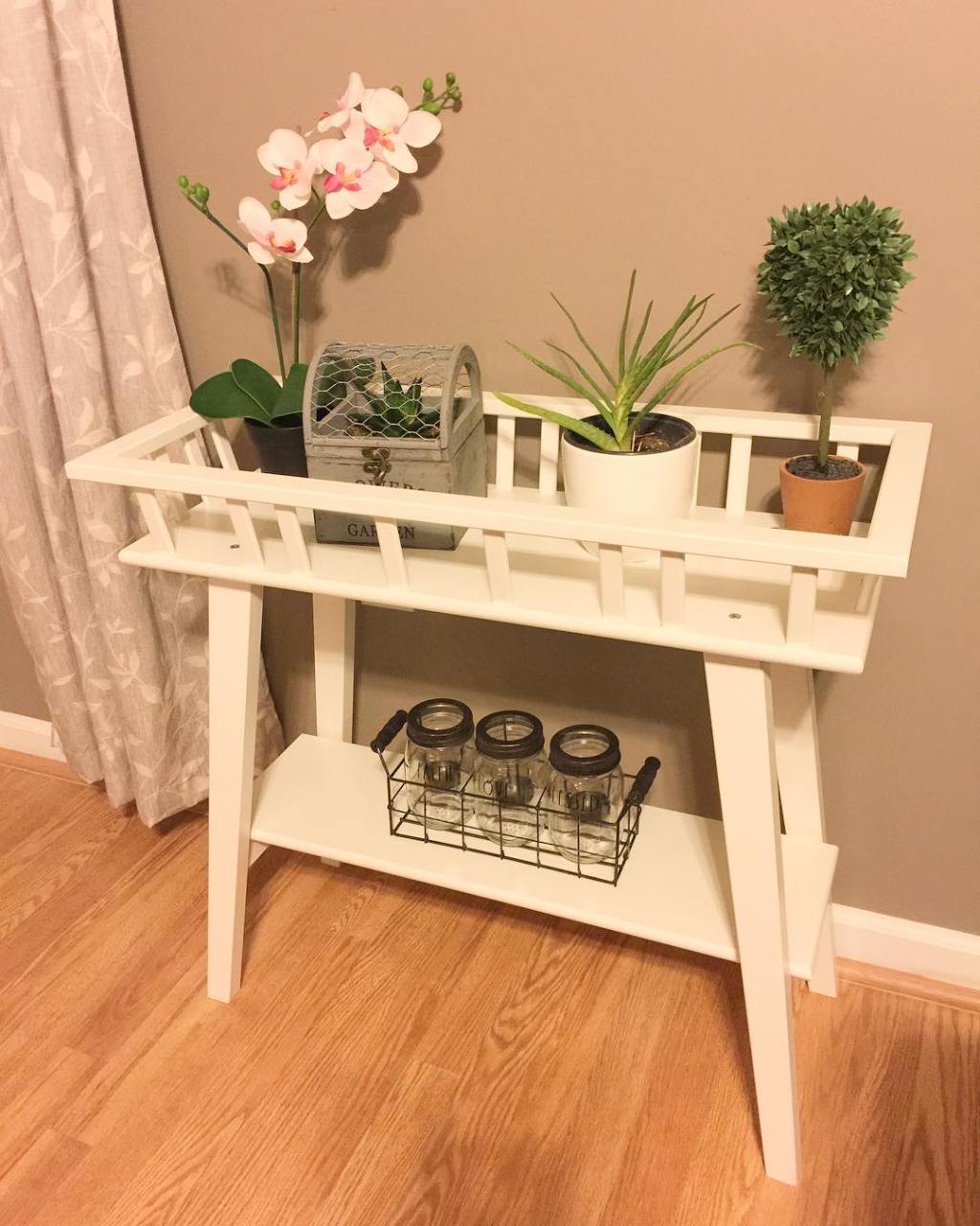 Nous n’avions pas très très faim alors le temps de vouloir manger et de ce decider du menu, j’ai tout de suite monté le meuble à plantes. Il était très facile à assembler puisque toute la partie du haut était déjà fini. Il ne restait juste qu’à ajouter les pieds et la tablette du bas. Et le tour était joué. Pendant ce temps là, mon mari était au téléphone avec ses parents.